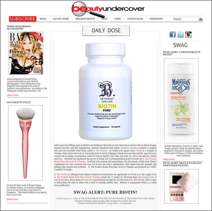 B. The Product is offering twenty Beauty Undercover Subscribers an opportunity to SWAG a 30-day supply of its B. The Product Biotin Pure Hair Growth Vitamins (retail $9.77) simply by following them on Instagram (or, if you do not have, liking them on Facebook) and entering through the on-line form here. This SWAG Alert is open to Subscribers 18 years or older with a valid US mailing address only.  Delivery is anticipated within 3-4 weeks from notification.
